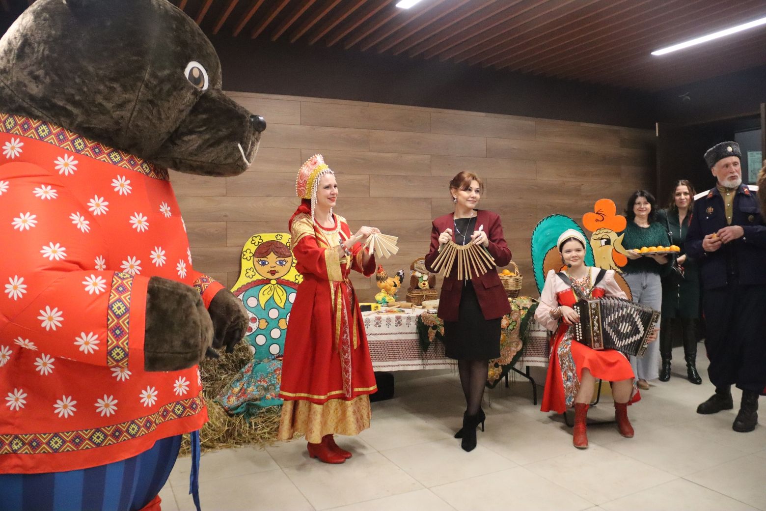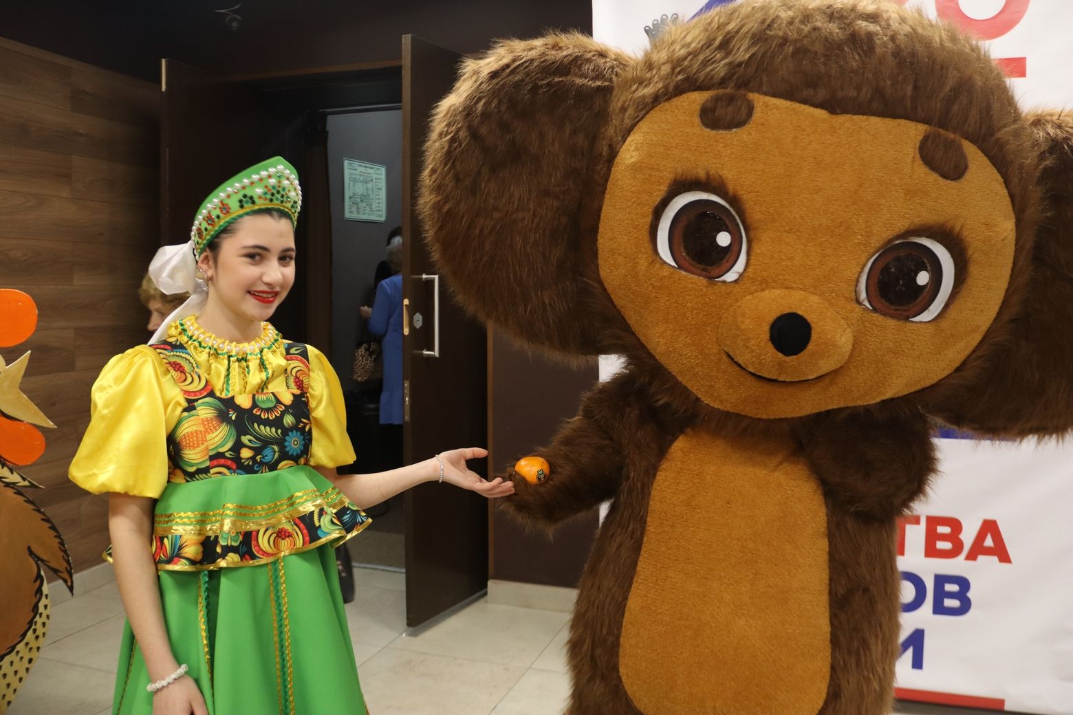 Уже с порога гостей встречала атмосфера дружбы и гостеприимства. В фойе была организована выставка, демонстрирующая культурное богатство народов, представленных коллективами Петушинского округа. А веселый Чебурашка с целой корзиной апельсинов создавал праздничное настроение, угощая всех желающих цитрусовыми.