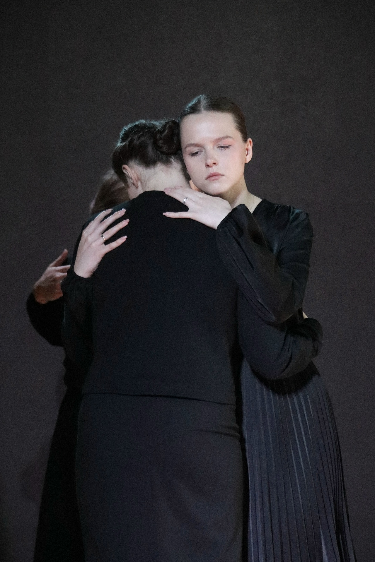 Спектакль создан в жанре художественного чтения. На сцене не было декораций и реквизита – все внимание зрителей было приковано к актерам и звучащему слову. Историю главной героини рассказали 14 артистов: 13 девушек и один молодой человек.